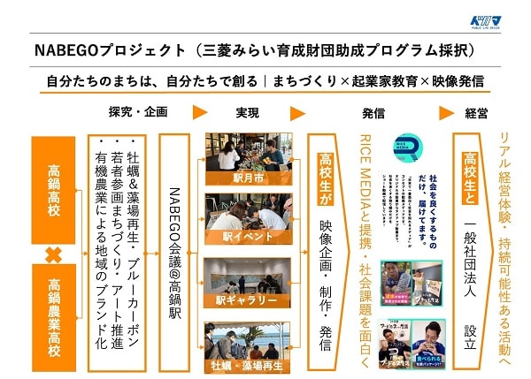 『ナベゴーメディア』では、動画制作のプロフェッショナルであるRICEメディアと一緒に、高校生が自ら地域課題を見つけ、取材・撮影・編集を通じて動画で発信することで、町内の小中学生に「この先輩と学びたい」と思ってもらい2校への進学希望者を増やすこと、さらに同世代や全国の高校生にも、「まちづくりは自分ごと」と感じてもらうことを目指している。