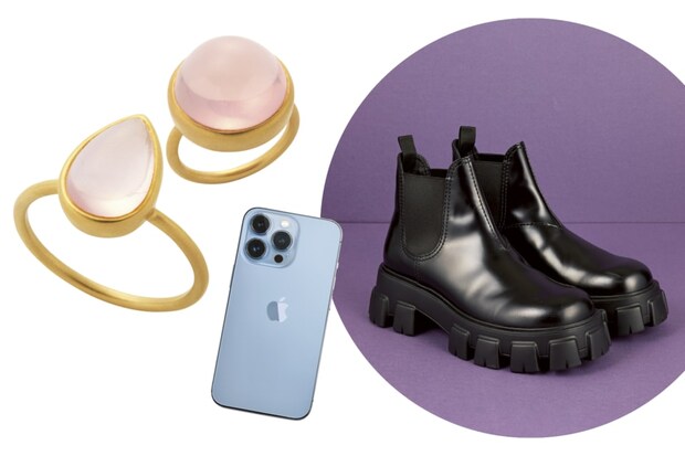左から:リング[K18YG×ローズクォーツ]¥239,800、リング[K18YG×ディープローズクォーツ]561,000(共にマリハ)、iPhone 13 Pro ¥122,800〜(Apple/Apple Storeコールセンター)、ブーツ[ヒール5.5㎝]¥152,900※予定価格(プラダ/プラダ クライアントサービス)