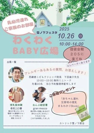 鎌倉エリアの子育て支援者が、10月26日(日)10:00〜14:00、神奈川県鎌倉市にあるカトリック雪ノ下教会のフェスタにて、乳幼児とその家族を対象とした体験型イベント「わくわくbaby広場」を開催する。