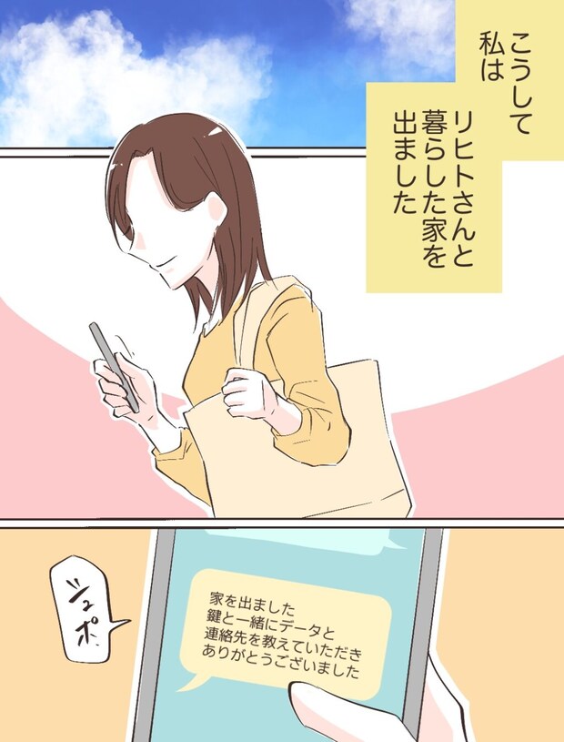 こうして私は、リヒトさんと暮らした家を出ました。晴れやかな気持ちで外に出た私は、『家を出ました。鍵と一緒にデータと連絡先を教えていただきありがとうございました』とユウコさんに連絡。ユウコさんが私たちの家を出ていったあの日、リヒトさんの本性に気付いていたユウコさんはモラハラと不倫の証拠写真のデータを渡してくれ、自分の連絡先を教えてくれました。それから私はずっとユウコさんと連絡を取り合い、リヒトさんと離婚するために協力してもらっていたのです。リヒトさんの不倫相手だったユウコさんに、まさか離婚の協力をしてもらうことになるなんて・・。不思議なものです。