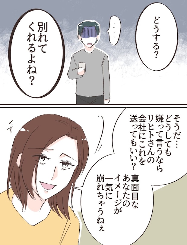 「どうする?別れてくれるよね?」私がそう言うと、リヒトさんはようやく状況を理解したようで青ざめたまま無言で立ち尽くしていました。私はくすっと笑いながら「そうだ・・。どうしても嫌って言うなら、リヒトさんの会社にこれを送ってもいい?真面目なあなたのイメージが一気に崩れちゃうねぇ」と言ってやりました。