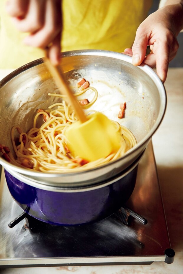 湯煎にかけながら、卵液がとろっとするまでスパゲッティとからめましょう。卵に火が入り過ぎて失敗! なんてことももうありません。