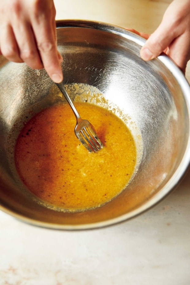 ②大きめのボウルに卵を割り入れ、卵黄、Aを加えてフォークでよく溶き混ぜる。