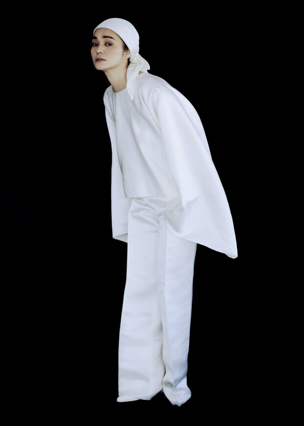2022年春夏コレクションから。上質な服の魅力を、伝えるのもモデルの仕事。ブラウス¥365,200、パンツ¥305,800、帽子¥134,200※全て予定価格(全てザ・ロウ/ザ・ロウ・ジャパン)、シューズはスタイリスト私物