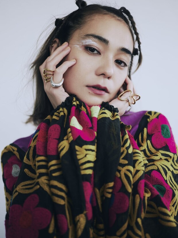 ブラウス¥132,000(STYLE WARS TOKYO)、右手小指リング¥72,050、右手薬指リング¥104,104、左手小指リング¥66,000、左手薬指リング¥80,000(全てシャルロット シェネ/エドストローム オフィス)