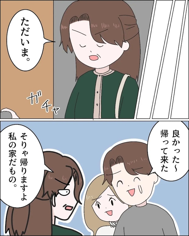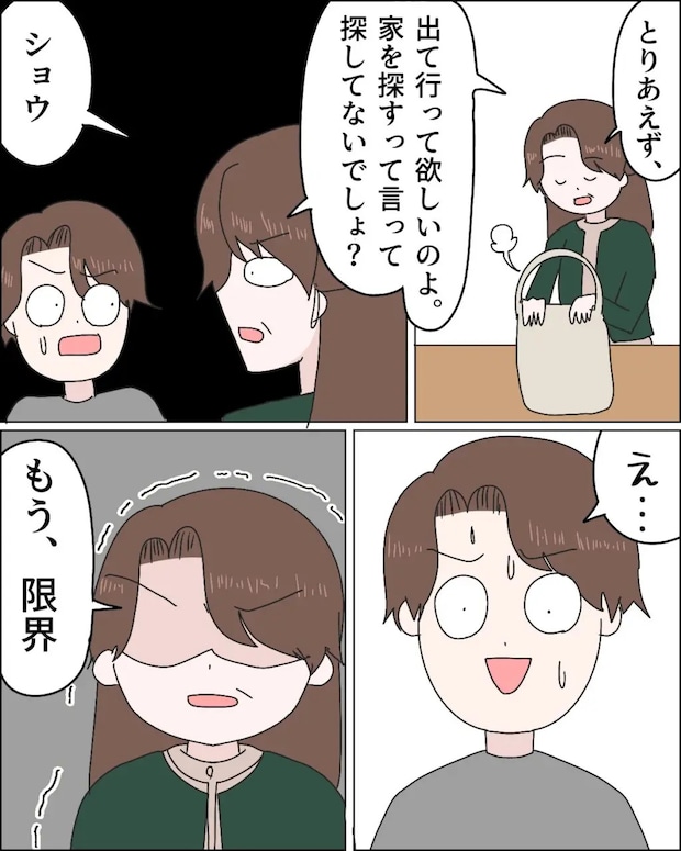 そして、「とりあえず、出て行ってほしいのよ。家を探すって言って探してないでしょ?ショウ」と切り出すと、案の定ショウは「え・・」と言葉に詰まり動揺。やはりその場しのぎのことを言って出て行く気などなかったのです。「もう、限界」
