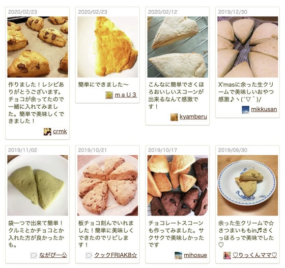 余った生クリームの消費のためにスコーンを作った、というつくれぽも複数ありました。生クリームを使いきれて、おいしいおやつができるのはとても便利ですね。