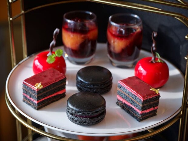 そして上段には、リアルなりんごの形を模した「禁断のりんご フロマージュムース」や、層の美しい「ミッドナイトブラック&ラズベリーぺパン」のほか、グラススイーツやマカロンなど、深紅と漆黒を基調とした4種のスイーツがお目見え。