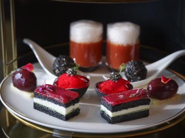 下段には、同じく深紅と漆黒を基調とした5種のセイボリーがずらり。湘南トマトを使用したガスパチョや、贅沢にズワイ蟹とキャビアを使ったノワールタルト、竹炭のモノクロサンドウィッチなどがラインナップする。