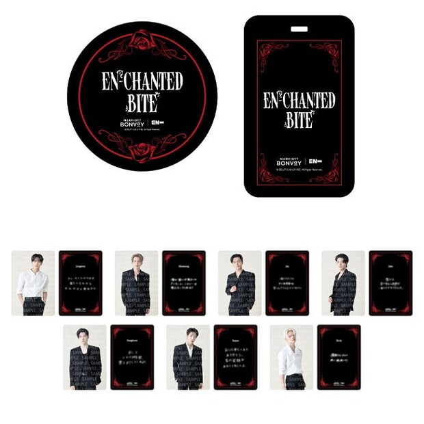 深紅と漆黒を基調とした“ヴァンパイア”コンセプトをイメージしたデザインのオリジナルコースターと、ENHYPENメンバー7名それぞれの直筆風メッセージカードが封入されたラゲージタグ。どちらも来店先着順・数量限定につき無くなり次第終了なので、早めのリザーブがおすすめ。