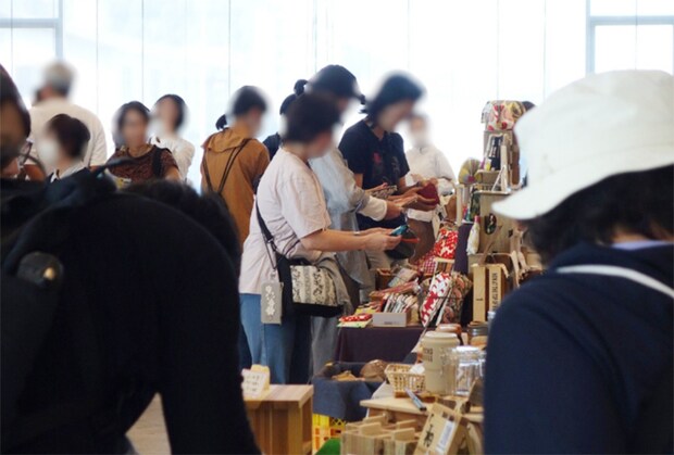 1階・2階に展開されるマルシェには、木工品やアクセサリー、焼き菓子など、地元クリエイターによるハンドメイド作品がずらりと並びます。