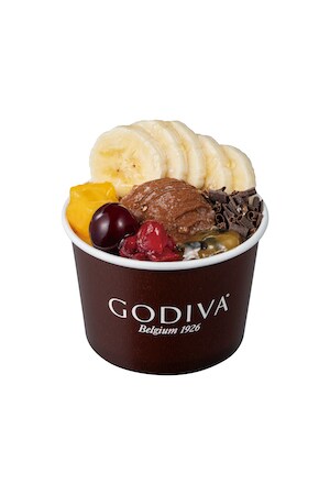 「アサイーボウル トロピカルフルーツ&ダークチョコレートアイス」940円(税込)は、ゴディバの濃厚な風味のチョコレートソフトクリームと爽やかなアサイーソルベに、フルーツとチョコレートをトッピングした沖縄限定のデザートだ。