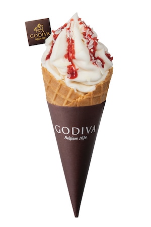 「ソフトクリーム ホワイトチョコレート&ストロベリーアイス」880円(税込)は、ホワイトチョコレートのソフトクリームを使用したパフェ風のソフトクリーム。いちごのアイスやソースとのマリアージュが楽しめる。コーンかカップ、いずれかをチョイスできる。
