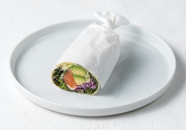 「アボカドとサーモンのバジルラップサンド」870円(税込)は、たっぷりのサラダとアボカドとサーモンをトルティーヤで巻いたラップサンド。