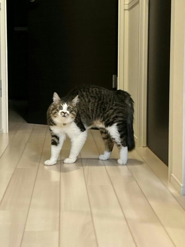 愛猫のほたてくんは飼い主さんのくしゃみを聞いて、かなりビックリしたご様子で…?