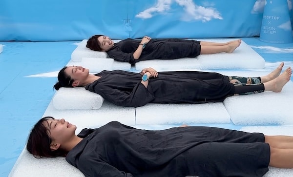 「ROOFTOP」の屋上外気浴スペースをブレインスリープがジャックし、通気性に優れた「ブレインスリープ ピロー」と「ブレインスリープ マットレス フロート」を設置。これにより、サウナで高まった熱を効率的に放散し、まるで“雲の上に浮かんでいるかのような外気浴”を体験できる。