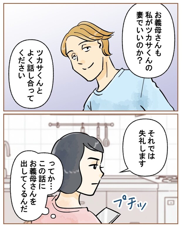 ツカサを独り残し、家を出た私に義母から電話が。電話の相手は義母。すると「話は聞いたわよ」と言い出す義母に「ツカサくん、離婚を決めてくれた感じですか」とたずねると、「え!?」と心底驚いたよう。息子が嫁に別れを切り出されたと知り、電話をかけてきて、「簡単に離婚を考えるなんて忍耐がない」と言い出す義母に、「でも」と反論の言葉を切り出しました。