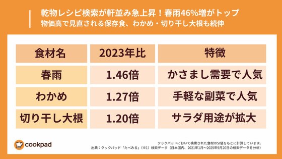 特に春雨の検索増加は、「かさまし」料理としての注目も背景にあります。食材価格高騰の中、ボリュームを出しながらコストを抑えたい家庭のニーズと合致しています。