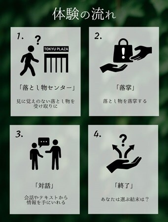 まずは、「落とし物センター」へ、身に覚えのない落とし物を受け取りに行き、落とし物を落掌する。そして、会話やテキストから情報を手にいれ、結末へと進んでいく。