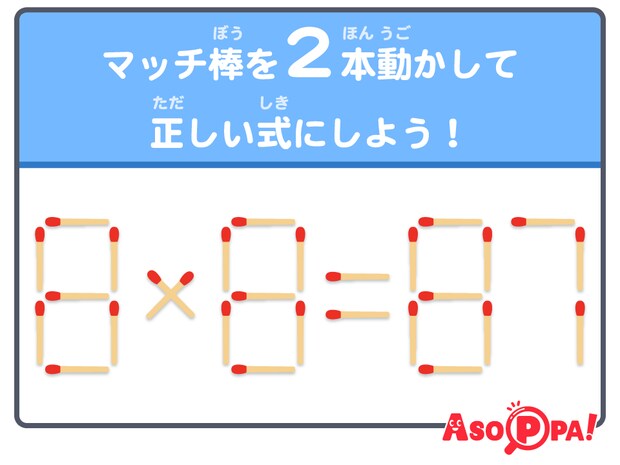 2025年10月9日 【マッチ棒クイズ40】マッチ棒を3本外して正三角形を4つにしよう! 脳トレでスッキリ ASOPPA! 答えはこちら ※他の答えがある場合もあります。 合っていましたか? ぜひ、他の問題にもチャレンジしてくださいね! マッチ棒を2本動かして正しい式にしよう 答えはこちら まとめ マッチ棒クイズは1本や2本など動かすだけですが、これがなかなか難しいですよね。 その分、解けた時には脳が活性化される気がします。 というわけで、 次回の「マッチ棒クイズ」もお楽しみに! 文/ASOPPA!事務局 < 1 2