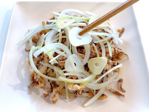 6. 5の乾しいたけ、2の玉ねぎの順に器に盛り付け、にんにくなどの薬味をのせる。