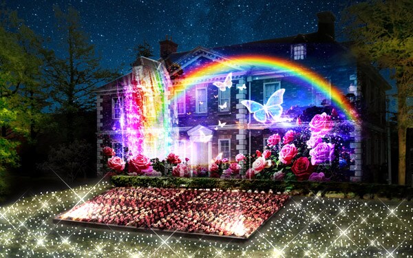 イギリス村プロジェクションマッピング「光の序章(Prelude of Light)」では、イギリス村の洋館に映し出される映像が訪れた人を幻想的な光の世界に誘ってくれる。