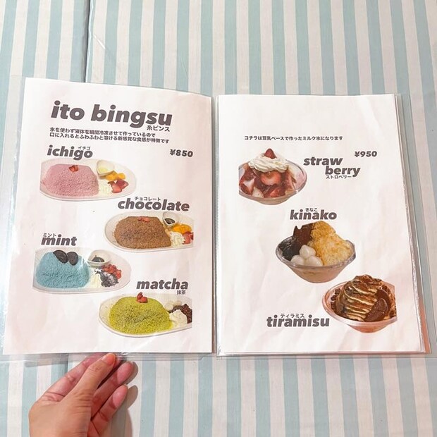 メニューは糸ピンスをメインとしたミルク氷などのスイーツメニューや、トッポギ、冷麺などの食事メニューもあります。