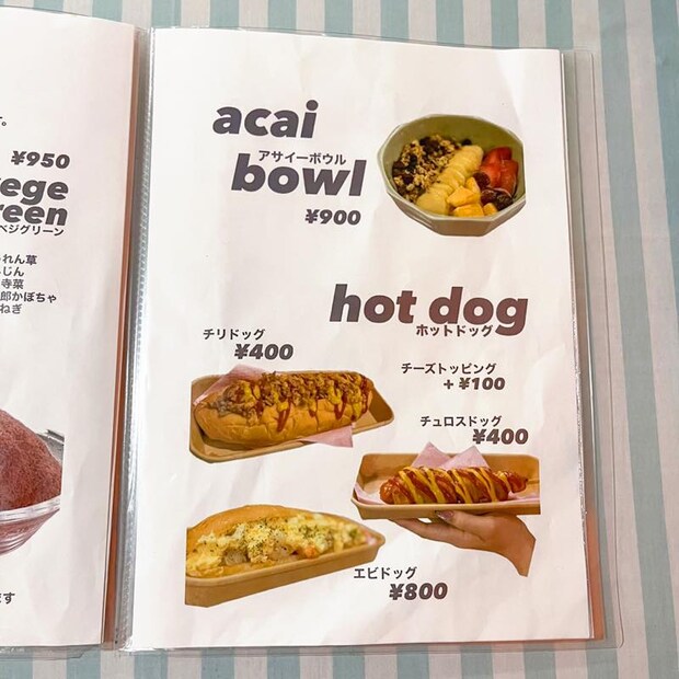また、ホットドッグや人気のアサイーボウルもあります。