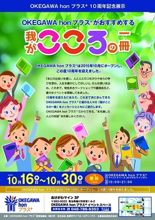丸善雄松堂が、埼玉県桶川市より業務を受託している、同市の「OKEGAWA hon プラス⁺」において、10周年記念展示「OKEGAWA hon プラス⁺がおすすめする我がこころの一冊」を、10月16日(木)~30日(木)に開催する。