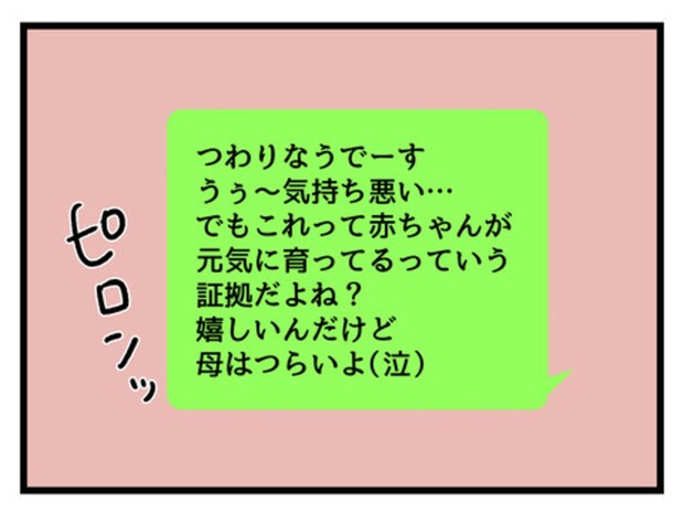 つわりの報告。エコー写真の添付。容赦ないキリコさんからのメッセージが送られていくのは妊活仲間のグループ。さすがにアイコちゃんも嫌な気持ちになりますよね。妊活時代のキリコさんがこの事態に遭遇していたら大変な騒ぎだったでしょう。