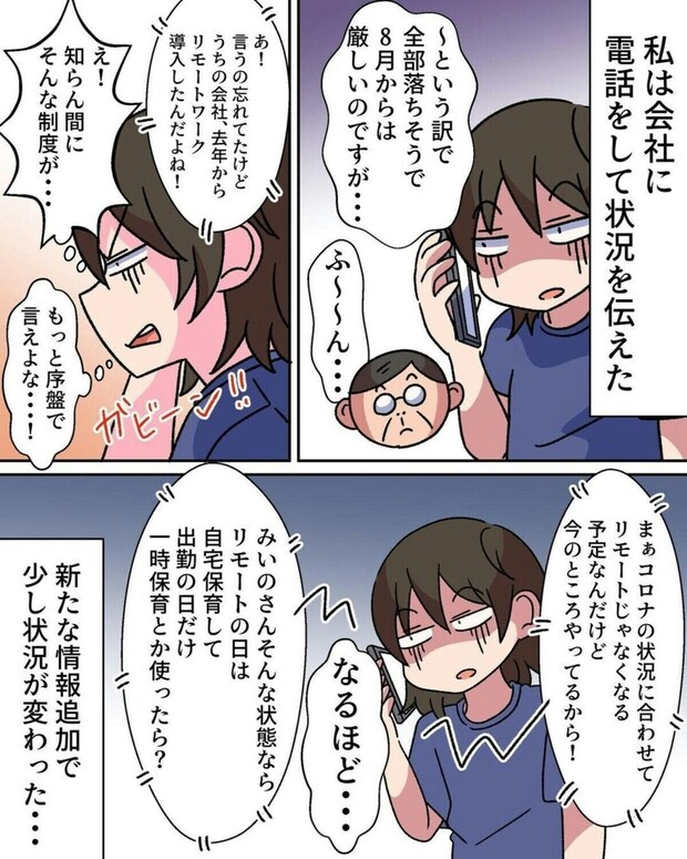 どの保育園も入園できず諦めていた矢先、夫が「一時保育」という選択肢を提案してくれました。また、今の保活の状況を会社へ連絡したところ「リモートワーク可」という新しい情報を手に入れることができました。