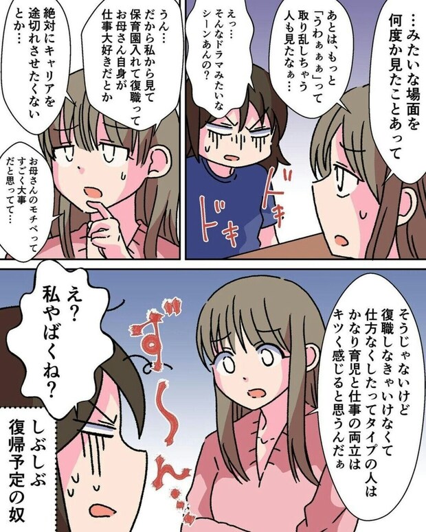 そんな保活真っただ中に、元保育士の友人が遊びに来ます。そして、保育士から見た、ワーママの大変さを語ってくれました。一気に、復職が不安になってしまいます…。