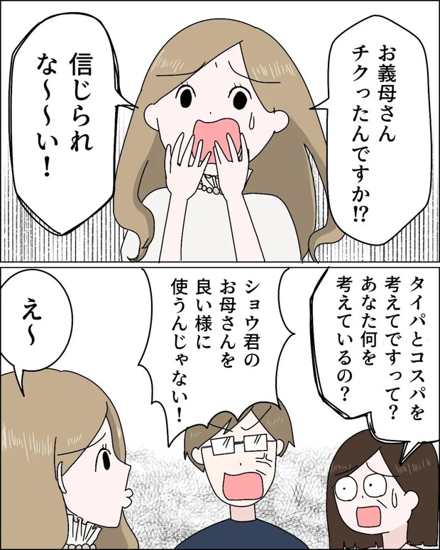 状況を察したアミちゃんは「お義母さん、チクったんですか!?信じられな~い!」と私を責めましたが、同居に至った経緯やこれまでのことを私から聞いていたアミちゃんのご両親は「タイパとコスパを考えてですって?あなた何を考えているの?」「ショウくんのお母さんを良いように使うんじゃない!」とアミちゃんを叱りました。しかし、アミちゃんは反省するどころか「え~」と不服そう。