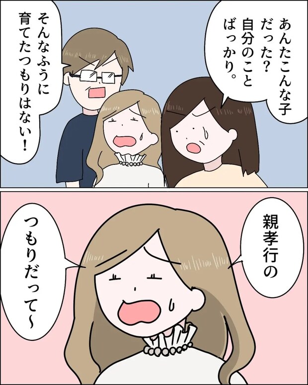 アミちゃんの様子を見たお母さんは「あんたこんな子だった?自分のことばっかり」と呆れ、「そんなふうに育てたつもりはない!」と叱るお父さん。ご両親にたっぷり叱られてもアミちゃんはまだ「親孝行のつもりだって~」と言い訳をしていました。