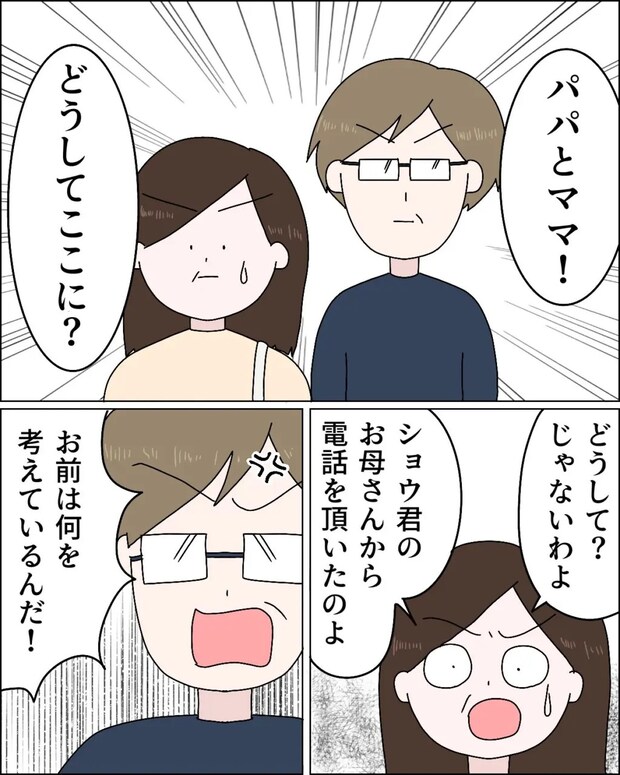 「パパとママ!どうしてここに?」と驚くアミちゃんに、ご両親は「どうして?じゃないわよ。ショウくんのお母さんから電話を頂いたのよ」「お前は何を考えているんだ!」とまくし立てます。