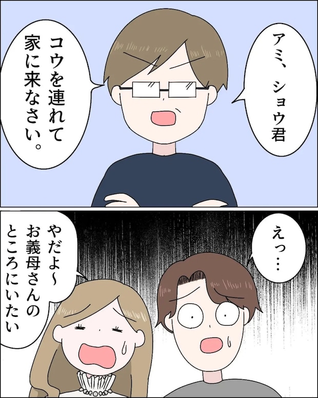 お父さんは厳しい表情で「アミ、ショウ君。コウを連れて家に来なさい」と有無を言わさぬ口調で言いました。突然のことにショウは「えっ・・」と困惑し、アミちゃんは「やだよ~。お義母さんのところにいたい」と反発。