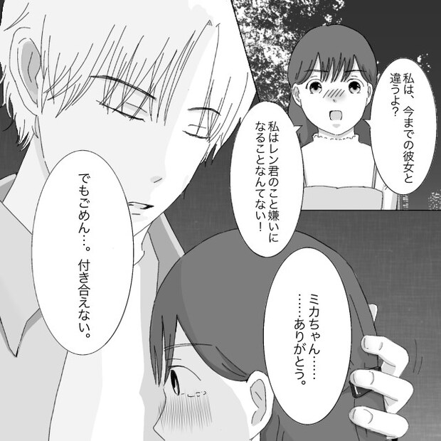 インカレサークルで、コミュ力が高く、周りへの気遣いもできるレンさんと出会ったミカさん。はじめは頻繁にくる連絡に戸惑っていましたが、レンさんの優しい言葉と気遣いに徐々に惹かれていき、知り合ってしばらくが経った頃、思い切ってレンさんに告白しました。一瞬驚いた表情を見せるレンさん。「オレも好きだよ」とミカさんの欲しかった返事をくれましたが、「でもオレ、いつも付き合った人にフラれるんだ・・・ミカちゃんにもフラれるかもしれないって思うと付き合うのが怖い、だから付き合えない」と悲しそうに言いました。ミカさんは「私は今までの彼女と違うよ?」と伝えますが、レンさんの気持ちは変わりません。「付き合えなくても、今と変わらず仲良くしてくれる?」と言うレンさんに、「うん・・・これからもよろしくね」とフラれたショックを隠すように笑って返事をしました。