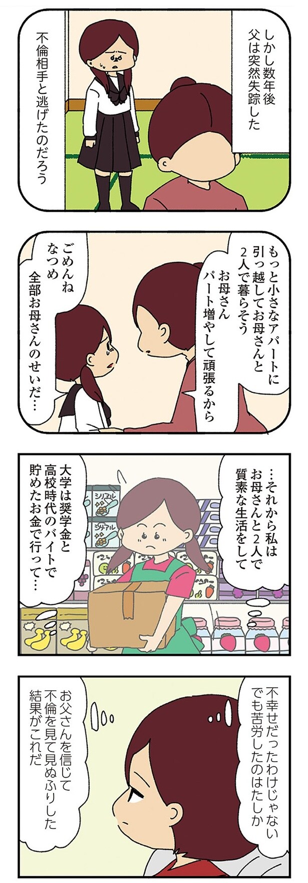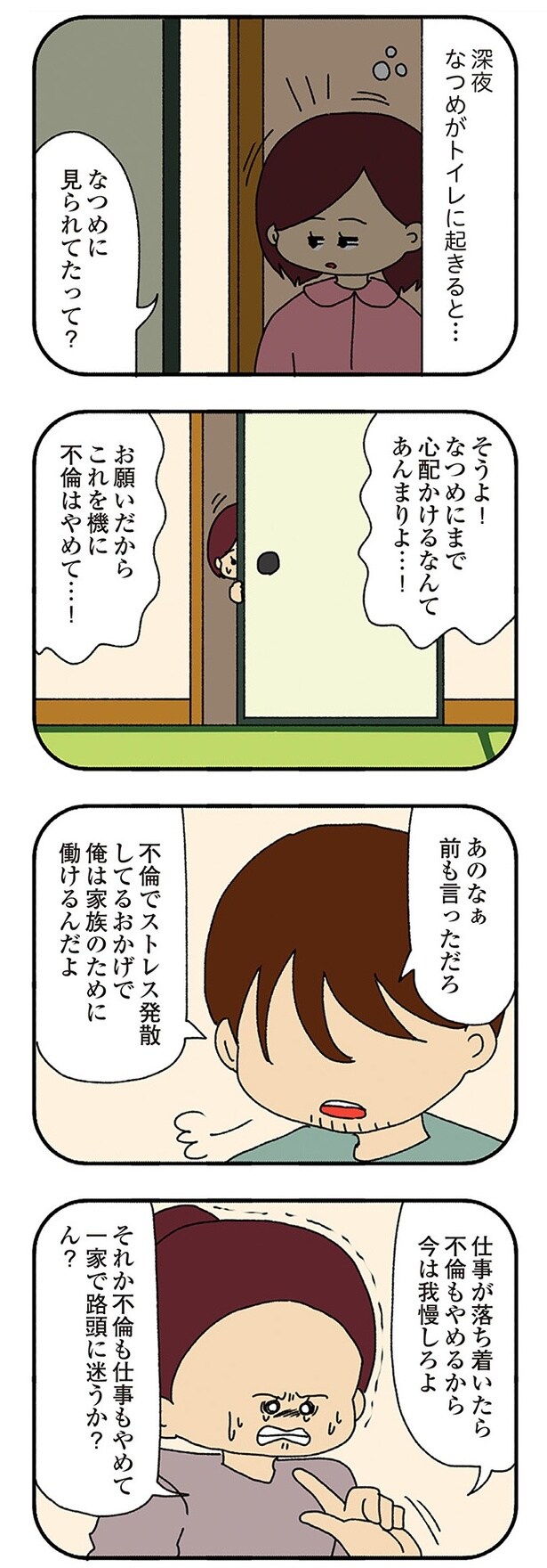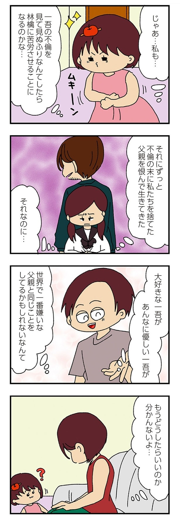 前回、一吾のことを怪しいと思いつつも、もし無実だったら申し訳ないと感じていたなつめ。一方で、一吾は不倫相手にどういうつもりなのか電話で問いただしていた。なつめはそれ以降モヤモヤとする日々が続く。モヤモヤを払拭したいが見て見ぬふりをするべきなのか悩んでいた…。