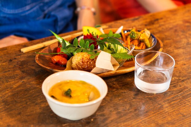 地元農家さんのお野菜たっぷりのおかずや、玄米ご飯のおにぎりが乗った優しいランチが心に、身体に染み渡る~!