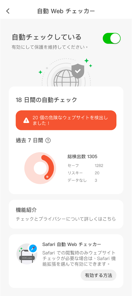 ユーザーが、詐欺など危険性があるウェブサイトにアクセスした際に、リアルタイムで警告を表示。フィッシング詐欺や偽ショッピングサイト詐欺対策に有効。