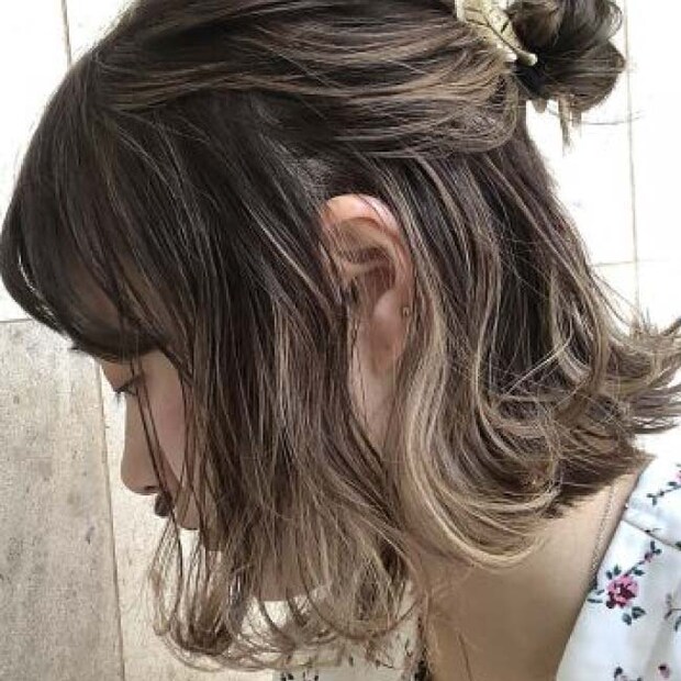 耳周りの毛だけを染めるイヤリングカラーは、ちょっぴり個性的なスタイルに。ハーフアップにすると、イヤリングカラーが出てアレンジが楽しくなる。オリーブグレージュはくすみのある色だから、派手すぎないのも嬉しい。