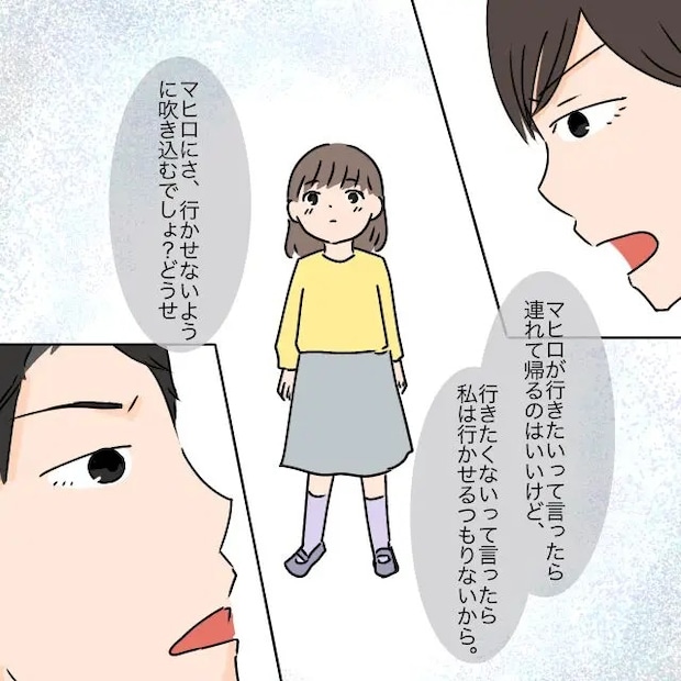 「マヒロが義実家に行きたいって言ったら連れて帰るのはいいけど、行きたくないって言ったら私は行かせるつもりはない」と言うと、「どうせ俺の実家には行かないようにってマヒロに吹き込むでしょ?」と私を信用していない様子。どこまでも私を悪者扱いする態度に、イライラが募ります。