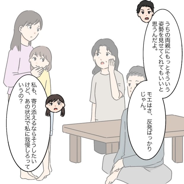 結婚の挨拶でタケルさんの実家を訪れたときにモエさんが大学院卒だと聞いた義両親は「だからこの歳まで結婚できなかったのね」「子どもはちゃんと産めるのか?」と言うなど、女性に学歴は必要ないと信じて疑わない人たちでした。事あるごとに嫌味や失礼な発言をする義両親とはうまく付き合えないと感じたモエさんは、「娘が会いたいなら行くけど義実家には泊まらない」「自分の両親の前で私に強気に出るのをやめてほしい」という2つの条件付きで、義両親の面会に応じることを約束します。それから数年が経ち、マヒロちゃんが小学3年になった頃、義実家に向かうことに。しかし、塾に行くと言ったマヒロちゃんに「女の人に学歴は必要ない」と言うなど、頑なに古い考えを主張する義両親に限界を感じたモエさんは、「これをもって縁を切らせていただきます」と言い、義実家を後にしました。その後、モエさんはタケルさんに「学歴があるからと言ってあんな風に言われる筋合いはない、はじめから必要ないって決められるのはおかしい」と自分の気持ちを伝えますが、「何か言われても聞き流せばいいじゃん、俺の顔を立てるとかできないの?」と共感するどころか自分の立場の心配しかしません。義両親とそっくりな態度に、モエさんは思わず下を向いて黙り込んでしまいます。
