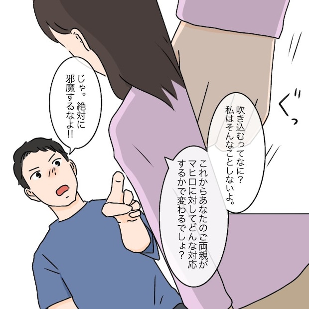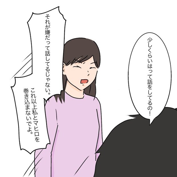 怒りが爆発しないようにぐっと堪え、「吹き込むことはしない、これからあなたの両親がマヒロにどんな対応をするかで変わるでしょ?」と冷静に伝えました。するとタケルは、「じゃあ絶対に邪魔するなよ」と指図するように言いました。
