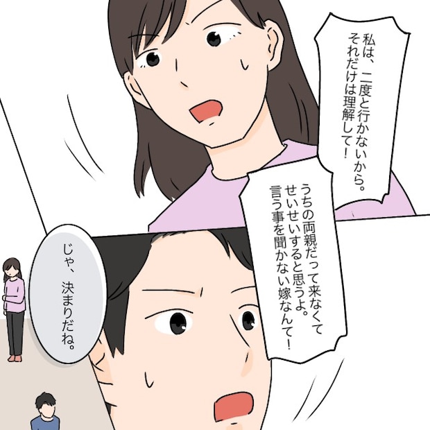 「私は二度と行かないから、それだけは理解して!」と言う私に、「うちの両親だって来なくてせいせいすると思うよ、言う事を聞かない嫁なんて!」と、嫌味な言い方をするタケル。「じゃ、決まりだね」そう言うと、私に背を向けて去っていきました。これでもう義両親に会わなくてすむ。私は内心ほっとしましたが、マヒロはこれからも義両親と付き合っていかなければならないことを考えると、不安な気持ちが消えませんでした。