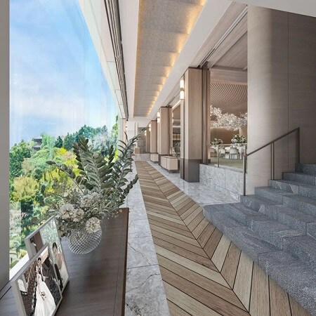まずは、東京の森と空を一望できるパノラマビューのホワイエ。ウェルカムスペースやデザートビュッフェエリアとしても活用でき、すべてのゲストに高揚感とフォトジェニックな瞬間を提供することができる。ここでは、絶景を楽しみながら、ゆったりとした歓談の時間を過ごせそうだ。