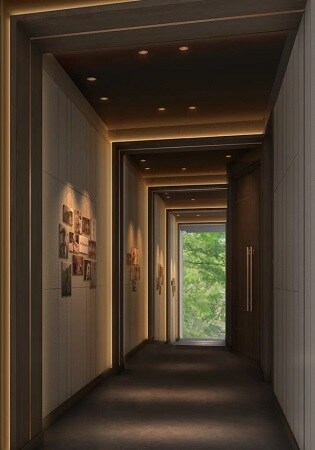 森の木立や岩などの自然素材を随所に取り入れ、木調の柔らかな質感を生かした設計により、訪れる人々がダイナミックに自然を感じられると同時に、上質で格式ある雰囲気を兼ね備えた空間を実現している。