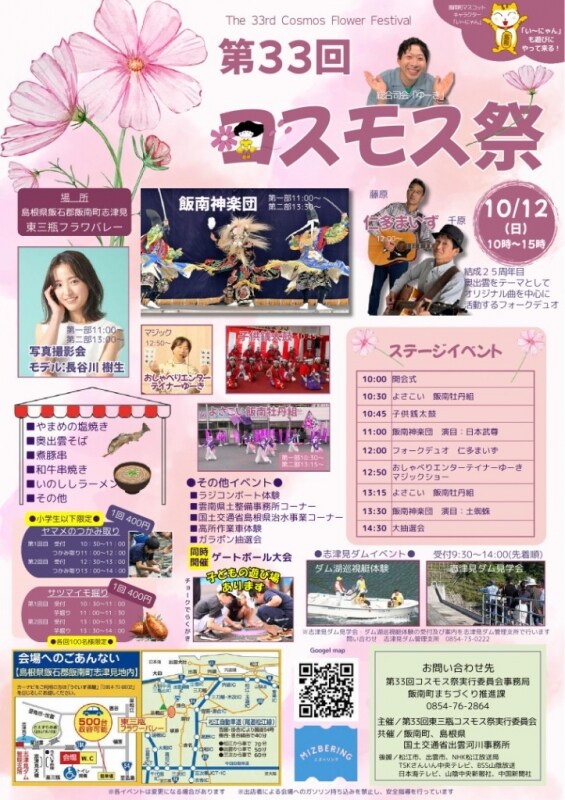 子ども達に人気のやまめのつかみ取りやラジコンボート体験、秋の味覚さつまいも掘りやモデル撮影会などコスモス祭イベント会場での催しもののほか、ダム付近で実施する志津見ダム見学会やダム湖巡視艇体験も実施します。