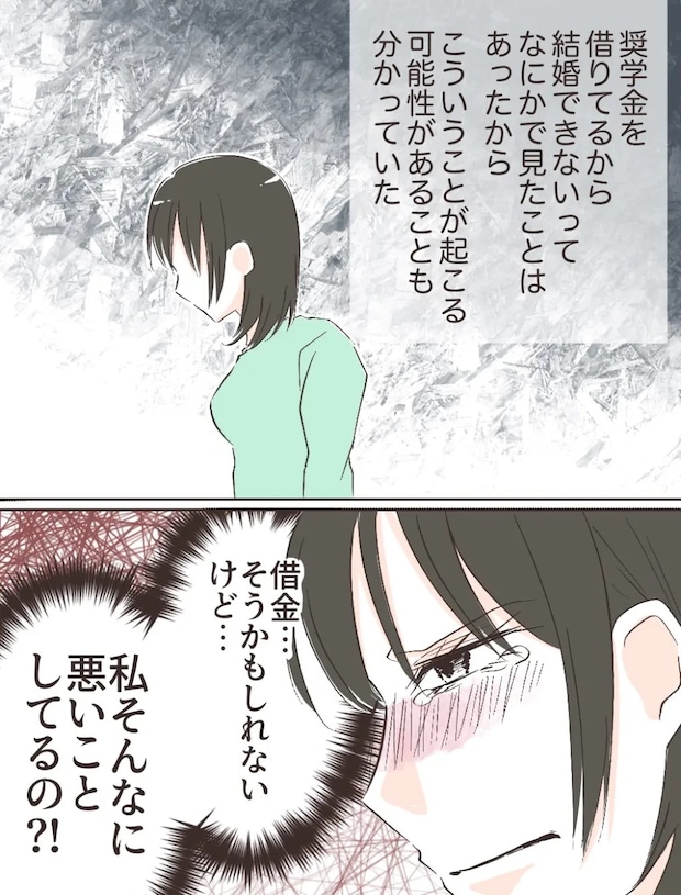 「奨学金を借りてるから結婚できないって、なにかで見たことはあったから、こういうことが起こる可能性があることも分かっていた・・借金・・そうかもしれないけど・・私そんなに悪いことしてるの!?」タモツのお母さんの言葉が頭の中でリフレインして、目から涙がこぼれました。