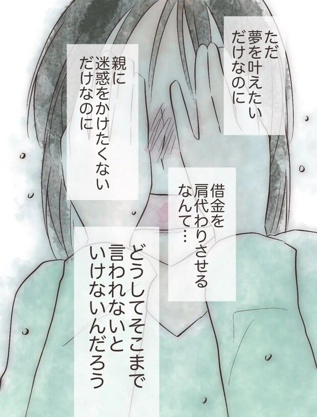 「ただ夢を叶えたいだけなのに、借金を肩代わりさせるなんて・・。親に迷惑をかけたくないだけなのに・・どうしてそこまで言われないといけないんだろう」考えれば考えるほど、とめどなく涙が溢れてきました。